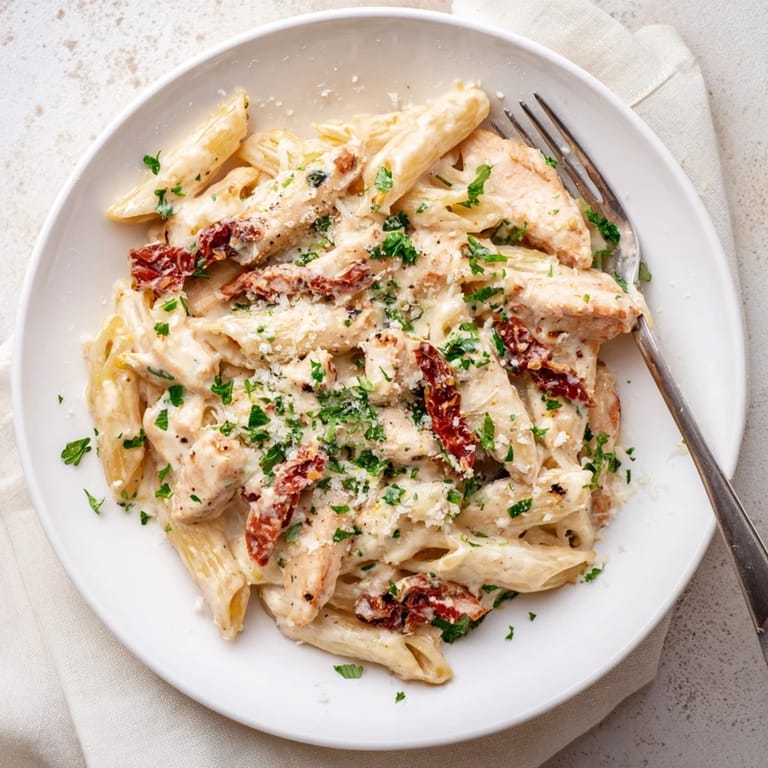 Pin It The aroma of garlic and cream hitting a hot skillet still stops me in my tracks every time. I first threw this together on a rainy Tuesday when the fridge held nothing but odds and ends—a jar of sun-dried tomatoes I'd bought on impulse, chicken breasts, and a box of penne. My roommate wandered into the kitchen, drawn by the smell, and we ended up eating straight from the pan while standing at the counter. That accidental dinner has since become the most requested dish at every gathering I host.